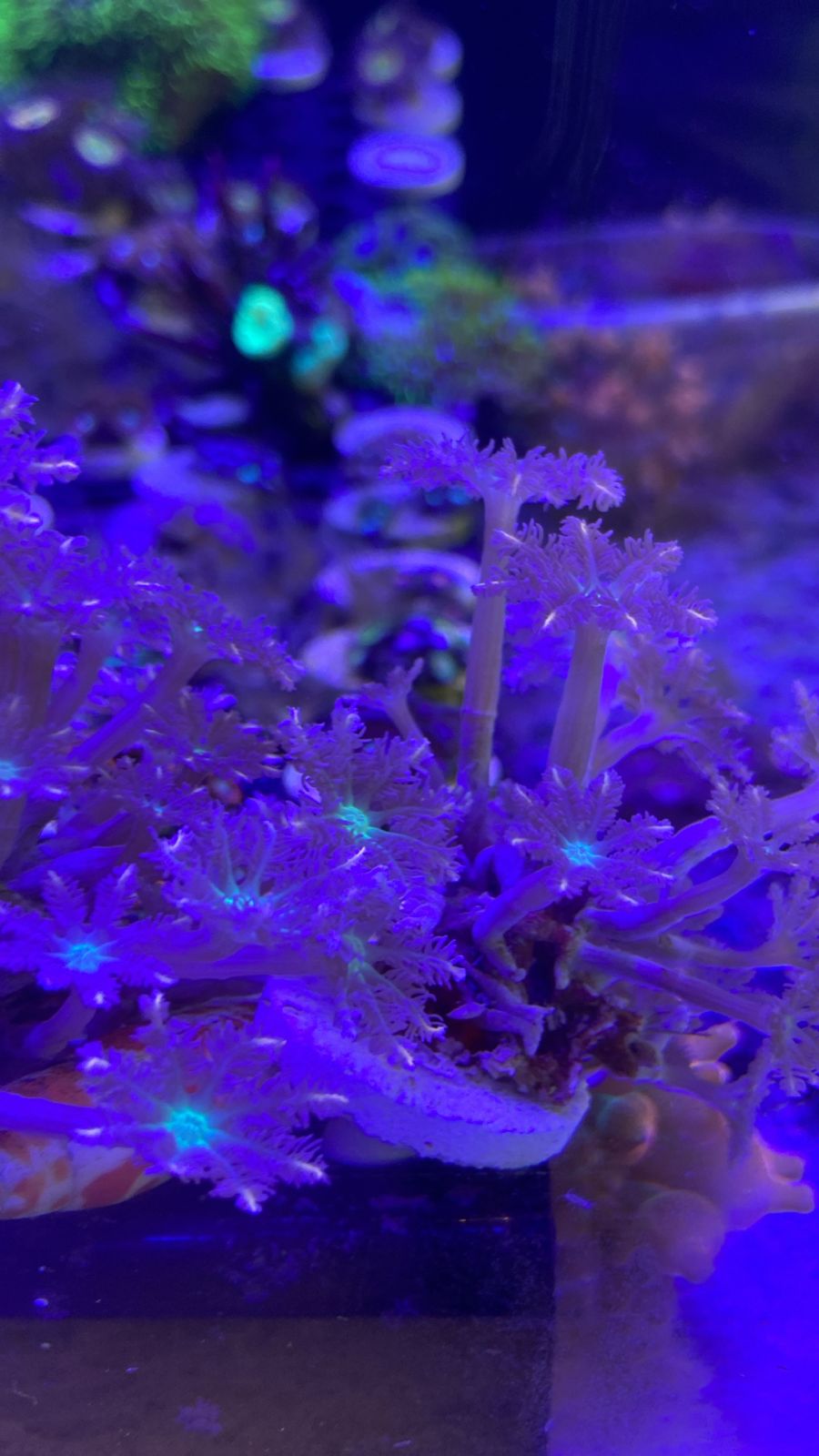 La Clavularia “Papaya” es un coral blando colonial de pólipo largo y fino, con tonos naranja intenso / papaya que le dan ese aspecto luminoso tan buscado en reef. Forma una base tipo estolón que se extiende sobre la roca y desde allí emergen los pólipos, que se abren durante el día y generan movimiento constante en el acuario.