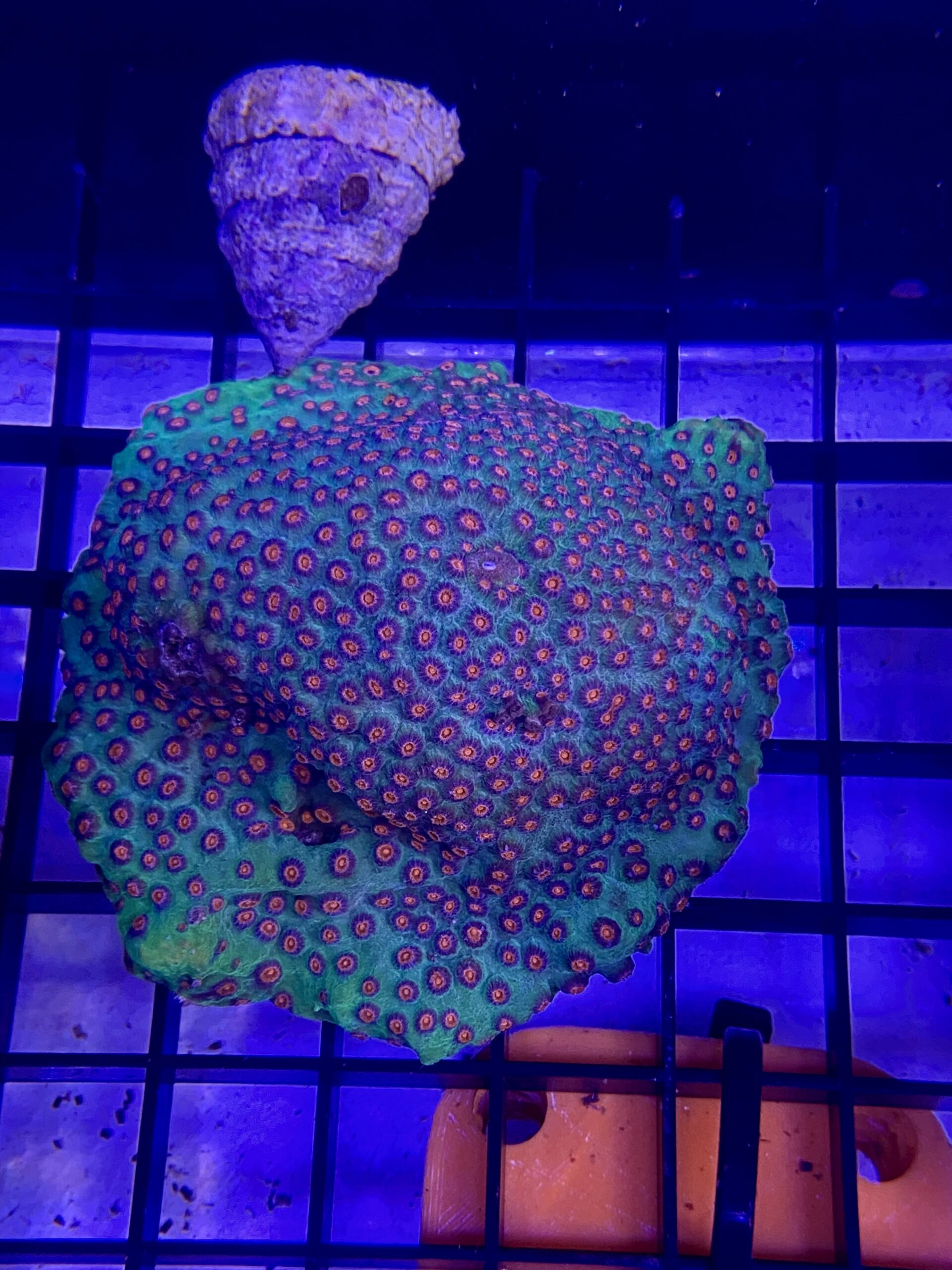 La Cyphastrea serailia es un coral SPS (Small Polyp Stony) caracterizado por su superficie cubierta de pequeños pólipos uniformes y su textura granular. Es una especie muy resistente y adaptable, ideal tanto para aficionados como para acuaristas experimentados. Puede encontrarse en una amplia gama de colores —verdes, naranjas, rosados o azulados— que varían según la iluminación y la química del agua. Prefiere iluminación moderada a baja y un flujo de agua intermedio, condiciones que permiten un crecimiento compacto y una coloración intensa. Es perfecta para cubrir rocas o zonas verticales del acuario, aportando textura y contraste al paisaje marino.