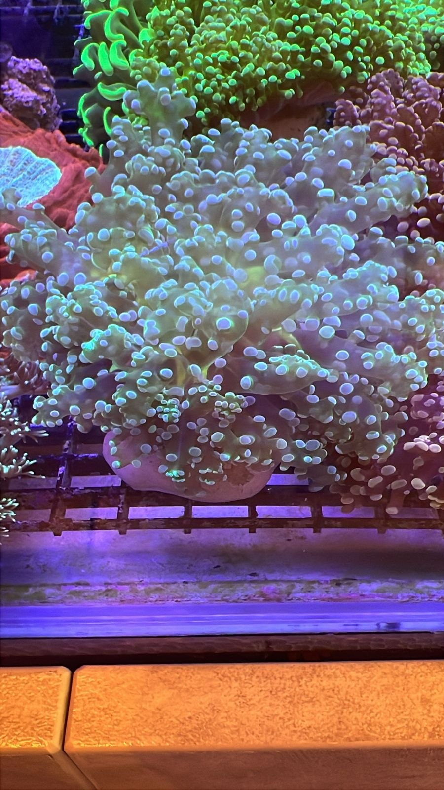 La Euphyllia divisa Green es un coral LPS de tentáculos largos y terminaciones en forma de “T”, característico por su color verde uniforme e intensidad marcada bajo iluminación azul. Forma colonias amplias y de movimiento fluido, lo que aporta volumen y dinamismo al acuario. Su estructura ramificada permite un crecimiento ordenado y una buena adaptación a distintos layouts de reef.