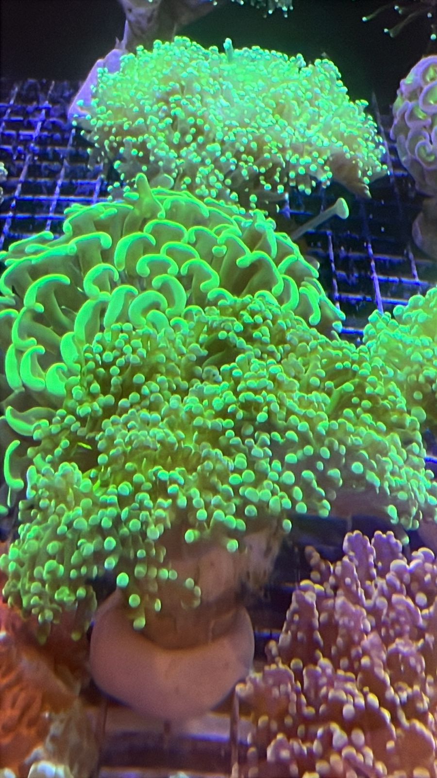 La Euphyllia divisa Green neon es un coral LPS de tentáculos largos y terminaciones en forma de “T”, característico por su color verde neon uniforme e intensidad marcada bajo iluminación azul. Forma colonias amplias y de movimiento fluido, lo que aporta volumen y dinamismo al acuario. Su estructura ramificada permite un crecimiento ordenado y una buena adaptación a distintos layouts de reef.