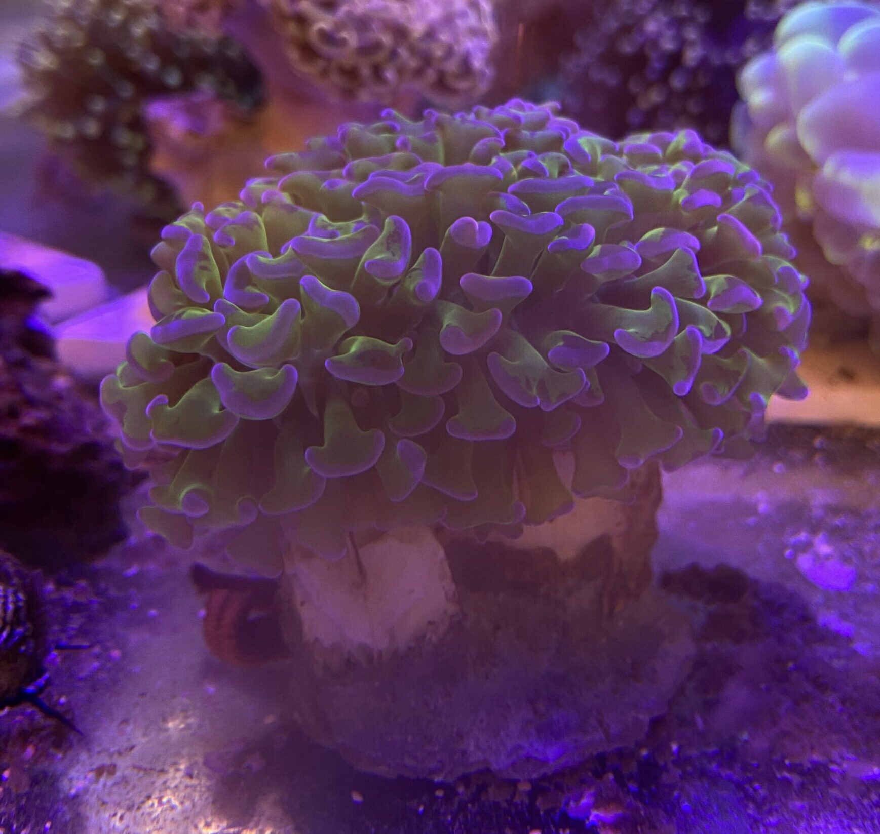 La Euphyllia ancora Wall Hammer Green Neon es un coral LPS muy apreciado por la forma característica de sus tentáculos en forma de martillo y por su intenso color verde fluorescente, que resalta con fuerza bajo la iluminación actínica. Al expandirse, genera un movimiento constante y elegante en el acuario, aportando dinamismo y un gran impacto visual. Es un coral de crecimiento relativamente rápido dentro de los LPS y suele formar colonias extensas, por lo que se recomienda dejar espacio libre a su alrededor para evitar el contacto con otras especies, ya que puede ser agresivo con sus tentáculos urticantes. Requiere un flujo de agua moderado y una iluminación media para mantener su salud y su color brillante. Por su belleza y presencia, es considerado una pieza protagonista en acuarios de arrecife.