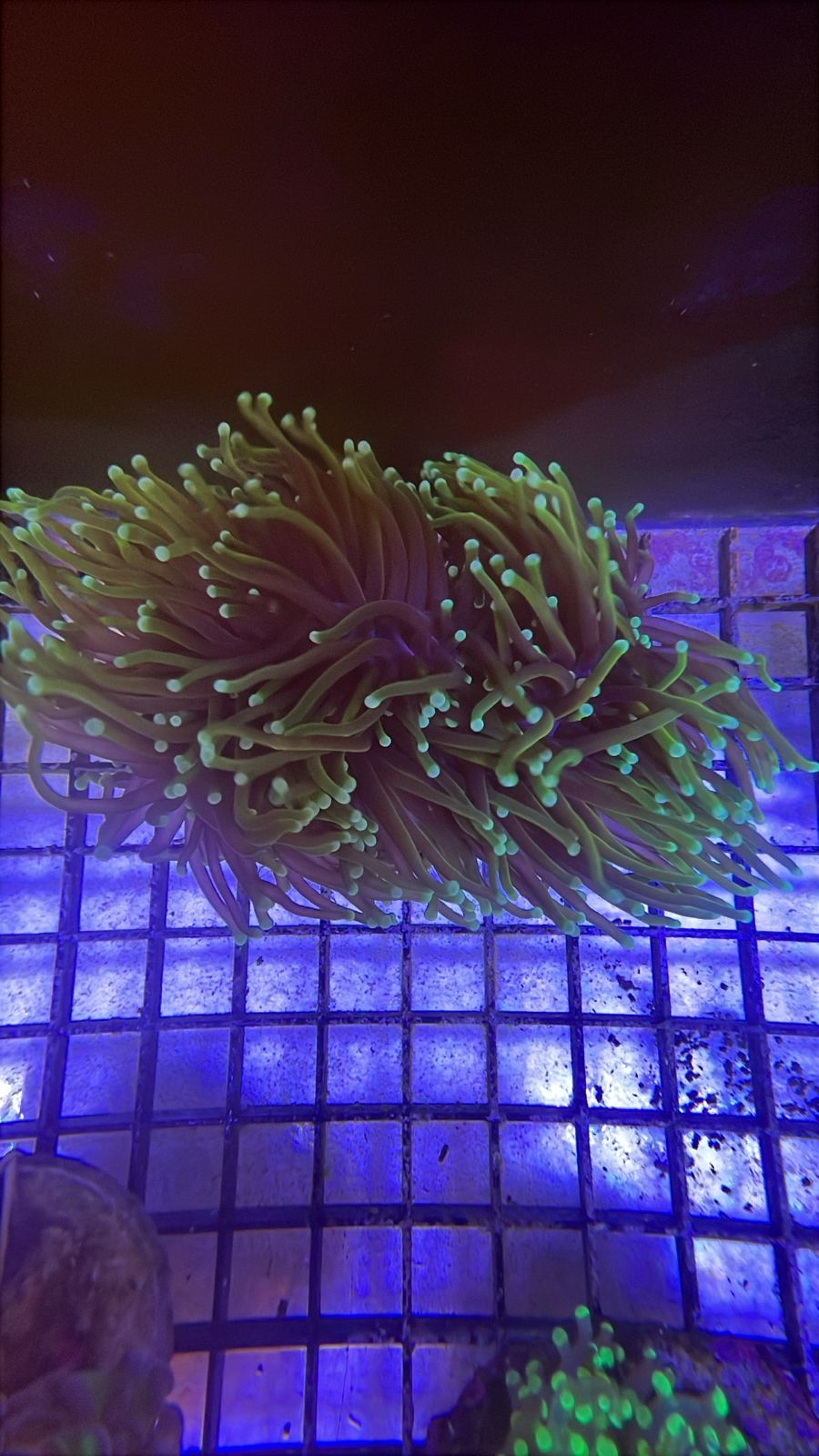 La Euphyllia glabrescens Dragon Soul es una de las variedades más valoradas de torch coral, reconocida por su combinación distintiva de tentáculos dorados o amarillos intensos con puntas violeta profundo. Bajo iluminación azul muestra una fluorescencia marcada que realza el contraste entre la base cálida y las terminaciones frías, convirtiéndola en una pieza central en cualquier reef.