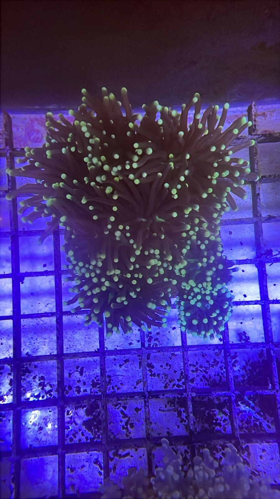 La Euphyllia glabrescens Torch Black Tips es una variedad de torch coral de tentáculos largos, finos y uniformes, con un tono base que puede ir desde el verde profundo hasta el marrón oscuro, rematado en puntas negras bien definidas. Bajo iluminación azul, las puntas adquieren un contraste marcado que resalta el movimiento amplio y rítmico característico de la especie. Es una pieza de fuerte presencia visual y muy buscada por coleccionistas.
