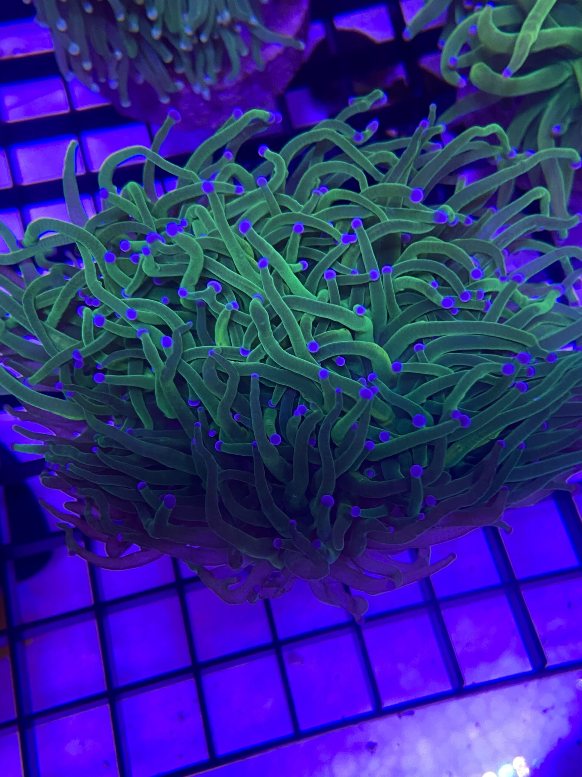 La Euphyllia glabrescens Green Metallic, también conocida como Torch Coral, es un coral LPS muy apreciado por su elegancia y movimiento fluido. Posee largos tentáculos terminados en puntas redondeadas de un intenso color verde metálico, que reflejan la luz y crean un efecto brillante dentro del acuario. Es una especie de crecimiento moderado que requiere iluminación media a alta y un flujo de agua intermedio, lo suficientemente suave para permitir el movimiento natural de sus tentáculos sin dañarlos. Debe colocarse con espacio alrededor, ya que puede extender tentáculos urticantes durante la noche. Ideal como coral protagonista, aporta dinamismo, color y textura a acuarios marinos de arrecife bien estabilizados.