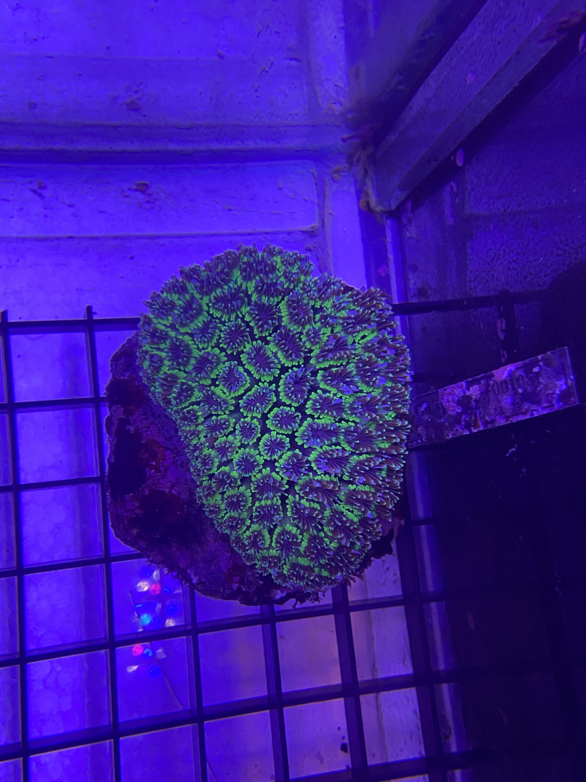La Galaxea fascicularis es un coral LPS muy apreciado por su apariencia única y su brillo intenso bajo iluminación actínica. Forma colonias compuestas por pequeños pólipos en forma de estrella, distribuidos sobre estructuras calcáreas alargadas. Sus colores suelen variar entre tonos verdes, marrones, crema y fluorescentes, lo que le aporta un aspecto vibrante y dinámico en el acuario.