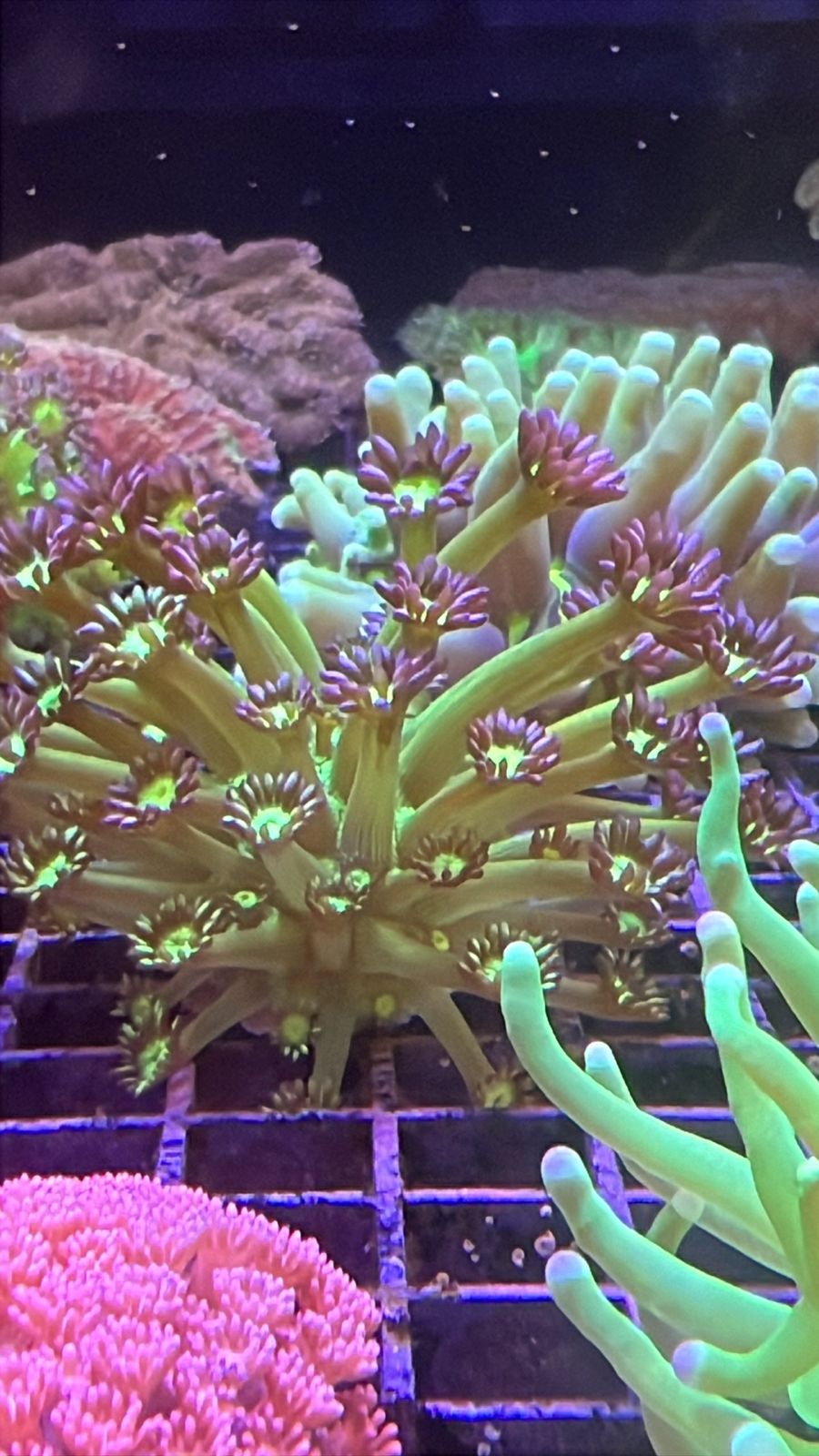 La Goniopora Flowerpot Var. Green Neon es una variedad de pólipo largo con una fluorescencia verde neón muy marcada, especialmente visible bajo iluminación azul. Sus tentáculos finos y extendidos forman un movimiento continuo y delicado, dando ese aspecto característico de “maceta con flores” que la vuelve una de las piezas más vistosas dentro de los LPS. Presenta una buena extensión diaria cuando el sistema está estable y muestra un color intenso incluso en acuarios mixtos.