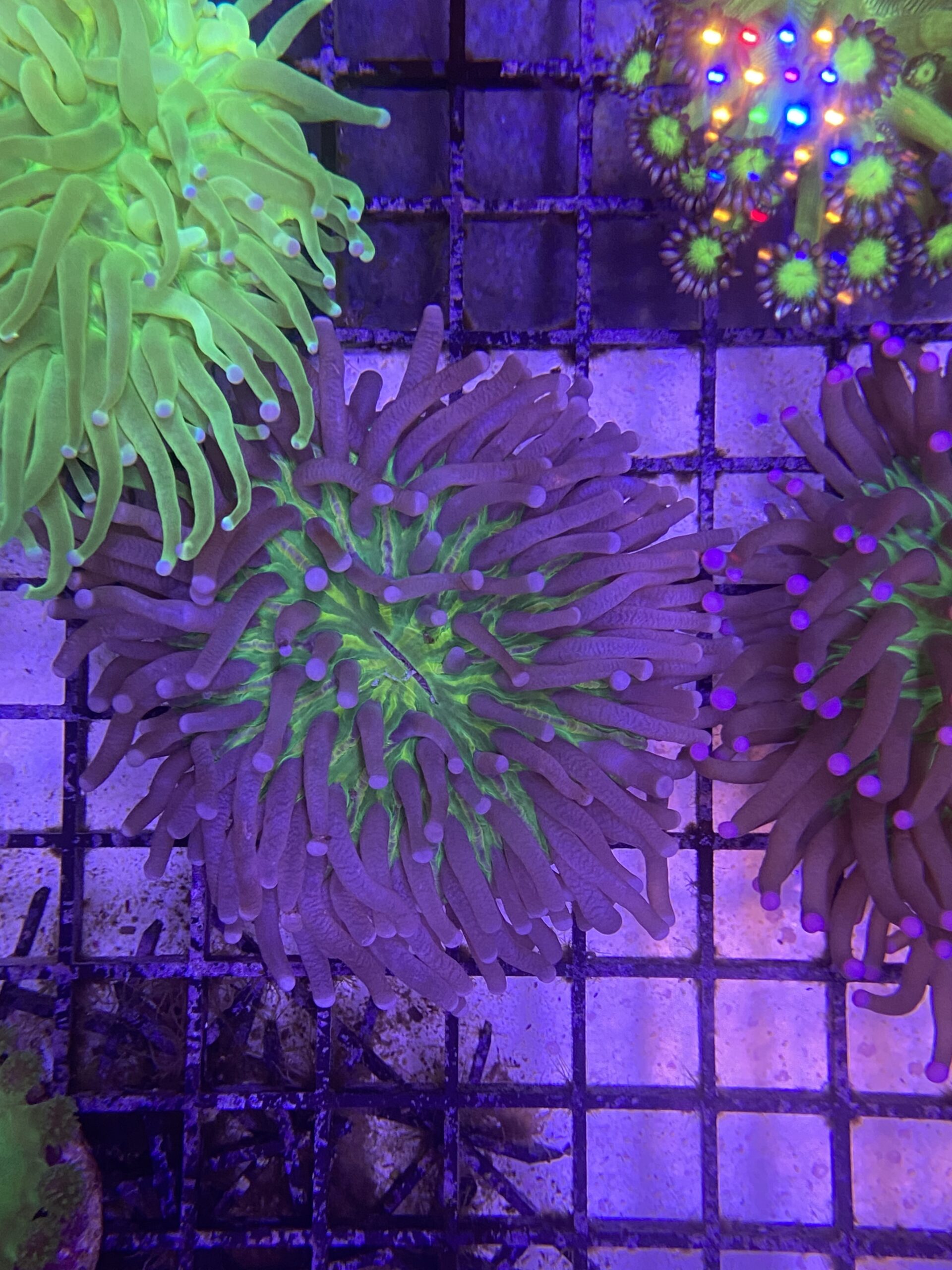 La Heliofungia actiniformis Long Tentacle Plate Green es un coral LPS que se distingue por su forma de disco plano y sus tentáculos largos, delgados y móviles, que en este caso presentan una intensa tonalidad en su plato ver fluorescente muy llamativa bajo la luz actínica. Al expandirse, ofrece un aspecto similar al de una anémona, generando un movimiento constante y aportando un fuerte atractivo visual al acuario. Es un coral solitario y de gran tamaño que conviene ubicar en el sustrato o en zonas bajas, con espacio suficiente para extenderse plenamente. Requiere iluminación media a alta y un flujo de agua suave a moderado, condiciones que favorecen su expansión y la intensidad de su color. Por su belleza y su comportamiento dinámico, es considerado un coral protagonista en cualquier arrecife.