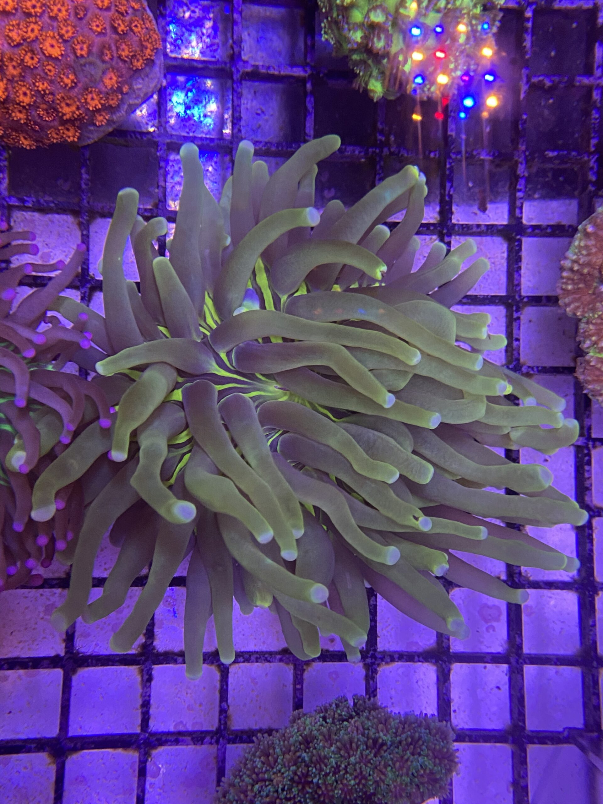 La Heliofungia actiniformis Long Tentacle Plate Pink Tips es un coral LPS que se distingue por su forma de disco plano y sus tentáculos largos, delgados y móviles, que en este caso presentan una intensa tonalidad amarilla muy llamativa bajo la luz actínica. Al expandirse, ofrece un aspecto similar al de una anémona, generando un movimiento constante y aportando un fuerte atractivo visual al acuario. Es un coral solitario y de gran tamaño que conviene ubicar en el sustrato o en zonas bajas, con espacio suficiente para extenderse plenamente. Requiere iluminación media a alta y un flujo de agua suave a moderado, condiciones que favorecen su expansión y la intensidad de su color. Por su belleza y su comportamiento dinámico, es considerado un coral protagonista en cualquier arrecife.