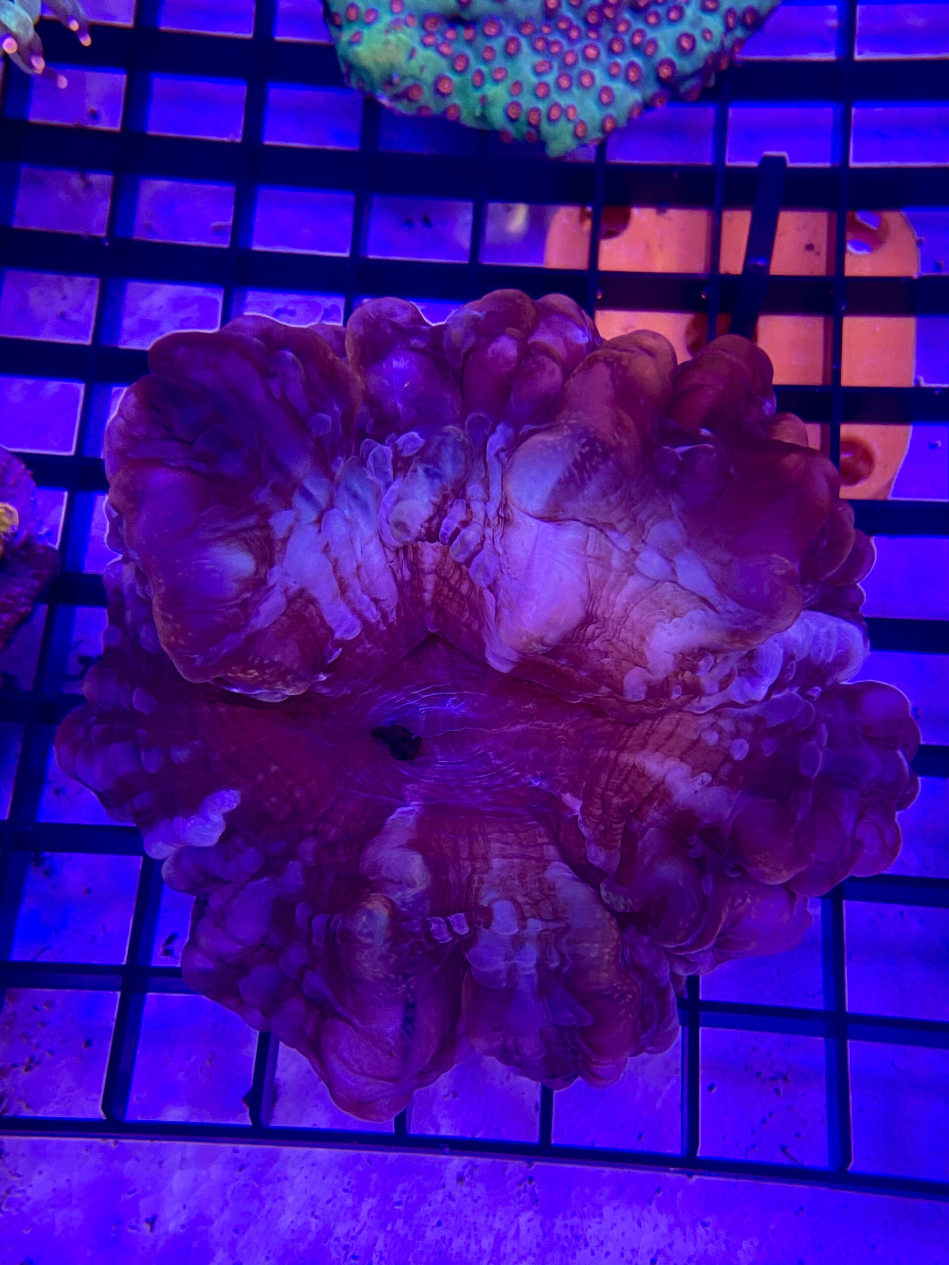 La Indophyllia cynarina lacrimalis Red Stripes es un coral LPS de gran tamaño y una de las piezas más llamativas para acuarios de arrecife. Presenta un cuerpo carnoso con surcos profundos y una textura translúcida que deja ver sus espectaculares franjas rojas metálicas. Su tonalidad cambia según la intensidad y el espectro de la luz, ofreciendo reflejos iridiscentes que realzan su belleza natural. Es una especie solitaria y de crecimiento lento que prefiere una iluminación moderada y un flujo de agua suave, lo que permite mantener el tejido expandido sin dañarlo. Ideal para acuarios marinos bien estabilizados que buscan una pieza central de alto valor ornamental.