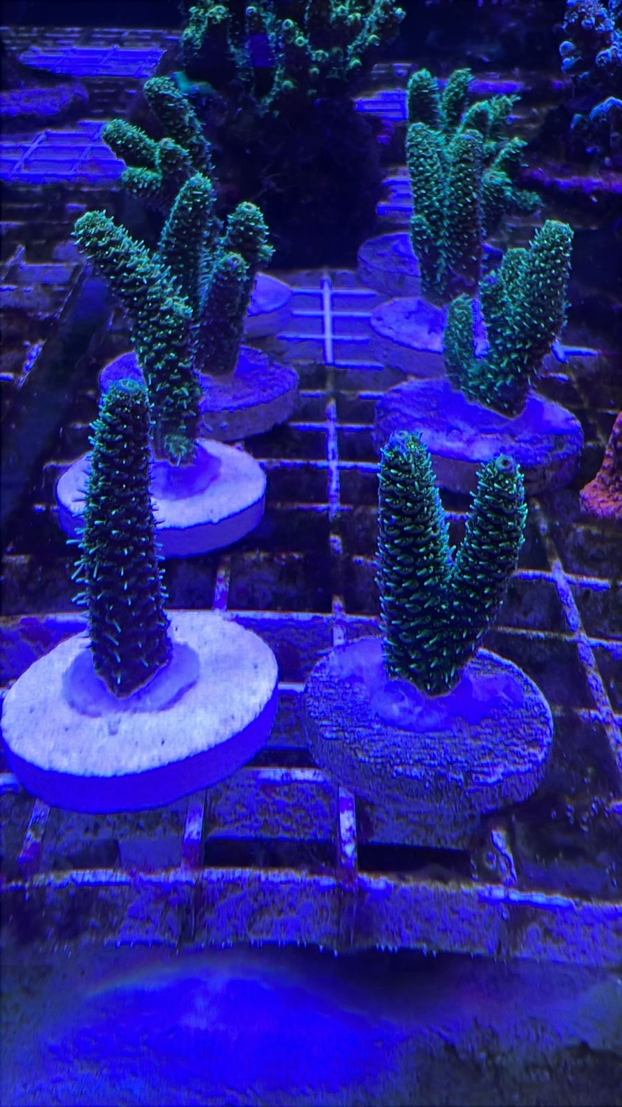 Requiere iluminación alta, movimiento de agua fuerte y parámetros bien controlados. Es un coral recomendado para acuarios maduros, con estabilidad en alcalinidad, calcio y magnesio. Bajo buena luz desarrolla su mejor fluorescencia y densidad de pólipos.