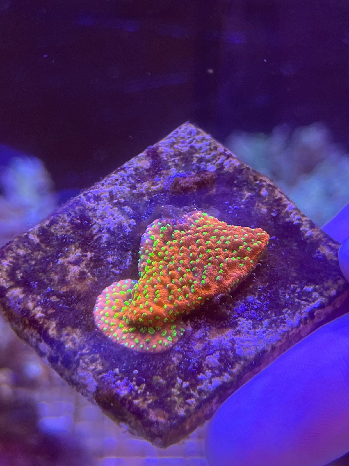 La Montipora Sunset es una de las montíporas más llamativas del hobby por su contraste extremo de colores: base naranja intensa y pólipos verde neón que parecen “pintados” sobre la superficie. Es una variedad en incrustación (encrusting), que crece expandiéndose como una alfombra sobre la roca, formando placas delgadas y muy uniformes. Tolera bien una amplia gama de condiciones, pero desarrolla su color más vibrante bajo luz media a alta y flujo moderado a fuerte, que ayuda a mantener la superficie limpia y bien oxigenada. No es exigente como un acropora, pero sí responde a la estabilidad del sistema, mostrando tonos apagados si los nutrientes caen demasiado o si hay baja iluminación. Por su crecimiento controlado y su estética tan marcada, la Sunset es una excelente opción para aportar color sólido y contraste a cualquier reef, sin la dificultad de los SPS más delicados.