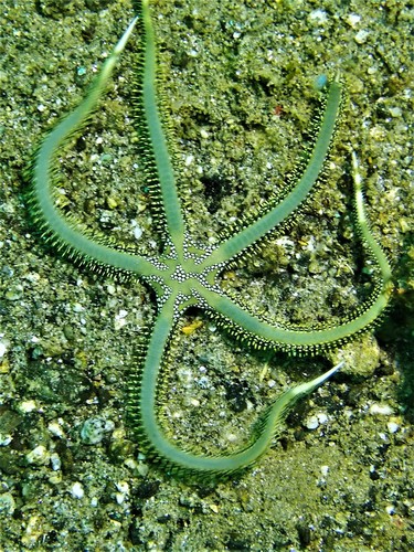 Ophiarachna incrassata es una ofiura grande y muy llamativa, conocida como estrella serpiente verde. Presenta un disco central robusto y cinco brazos largos, gruesos y extremadamente móviles, que utiliza tanto para desplazarse como para capturar alimento. De hábitos principalmente nocturnos, suele permanecer oculta durante el día y activarse con la caída de la luz. Es omnívora y oportunista: consume restos de comida, pequeños invertebrados y, si no está bien alimentada o el sistema es chico, puede intentar capturar peces lentos o debilitados. Requiere acuarios marinos grandes, bien maduros y con abundantes refugios, además de una alimentación regular y controlada. Es resistente y longeva, pero no se recomienda para acuarios pequeños ni con peces muy chicos o delicados.