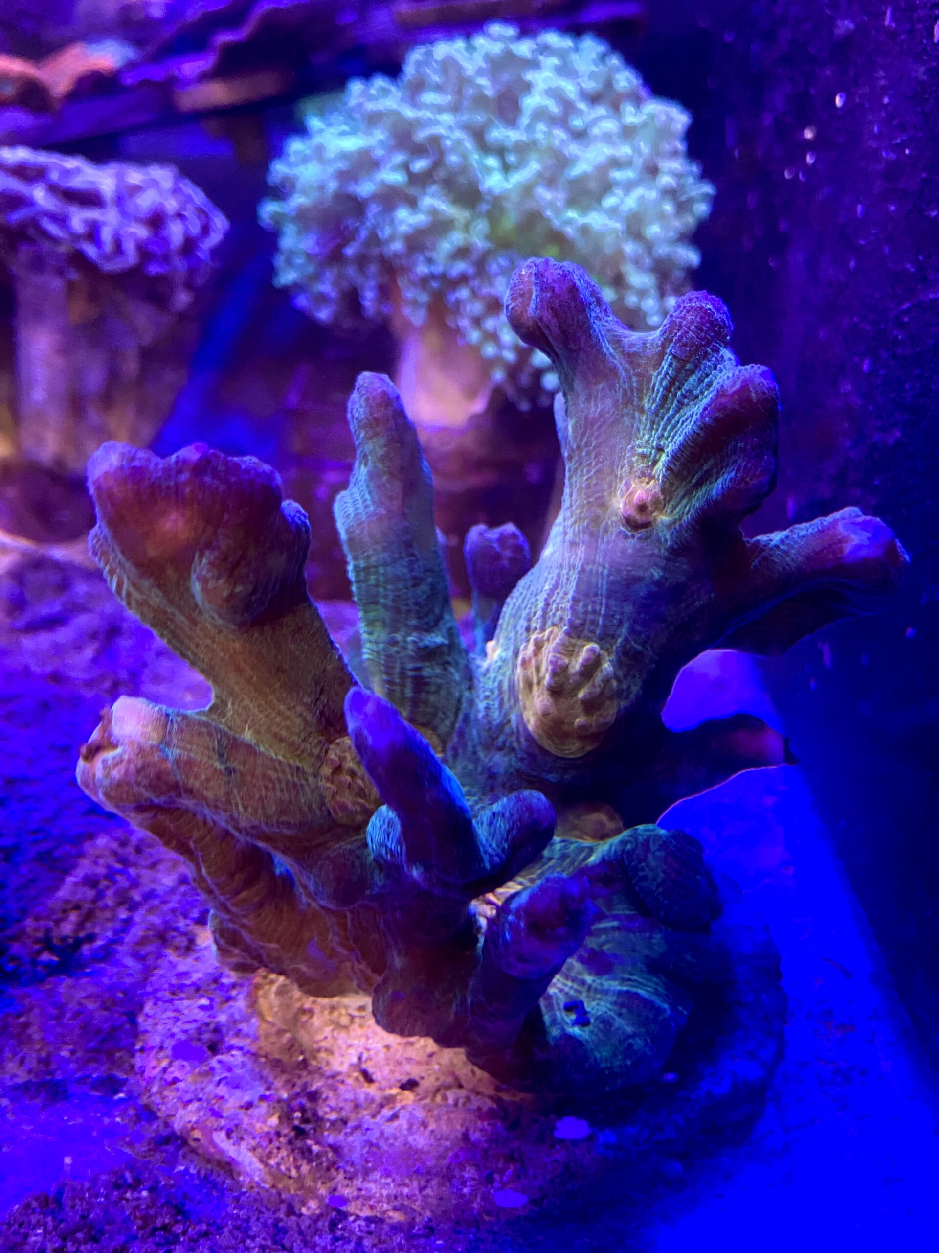 El Pectinia coral, también conocido como coral galaxia folded o coral chalice de dientes de dragón, es un LPS (Large Polyp Stony) muy llamativo por su crecimiento en forma de láminas delgadas con bordes ondulados y puntiagudos que le dan un aspecto único. Sus colores suelen variar entre verdes fluorescentes, púrpuras, azules y tonos multicolores que destacan especialmente bajo iluminación actínica. Aunque es un coral relativamente resistente, requiere colocarse en zonas con iluminación moderada a baja y flujo de agua intermedio, evitando corrientes demasiado fuertes que puedan dañar sus delicadas extensiones de tejido. Durante la noche despliega largos tentáculos urticantes, por lo que necesita espacio libre alrededor para evitar quemar corales vecinos. Se alimenta principalmente de la fotosíntesis de sus zooxantelas, pero también acepta alimento suplementario como artemia, mysis o fitoplancton, lo que favorece su crecimiento y realce de color. Por su belleza y sus formas inusuales, el Pectinia es una pieza muy valorada en acuarios de arrecife y suele convertirse en un punto focal dentro del tanque.