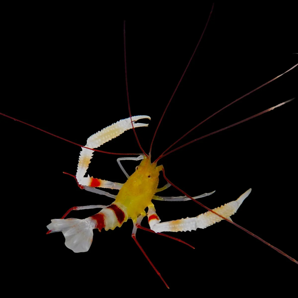 Camarón de arrecife muy llamativo por su coloración dorada y sus largas antenas blancas, que le dan una presencia elegante dentro del acuario. Stenopus scutellatus suele establecerse en una cueva o estructura de roca, desde donde interactúa con el entorno y defiende su territorio inmediato.