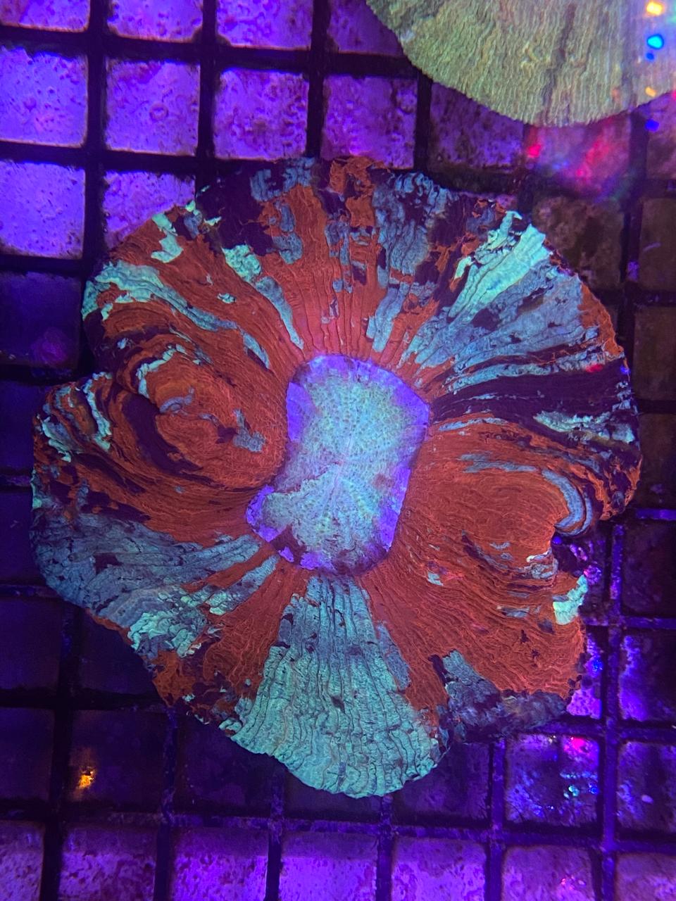 Este coral LPS, también conocido como brain coral, destaca por su base roja vibrante acompañada de una segunda tonalidad verde, naranja o púrpura, generando un contraste dramático y cautivador. Su pólipo es robusto, carnoso y se expande lateralmente, ideal para colocar en zonas bajas o medias del acuario donde se destaque sin competir por espacio con otros corales.