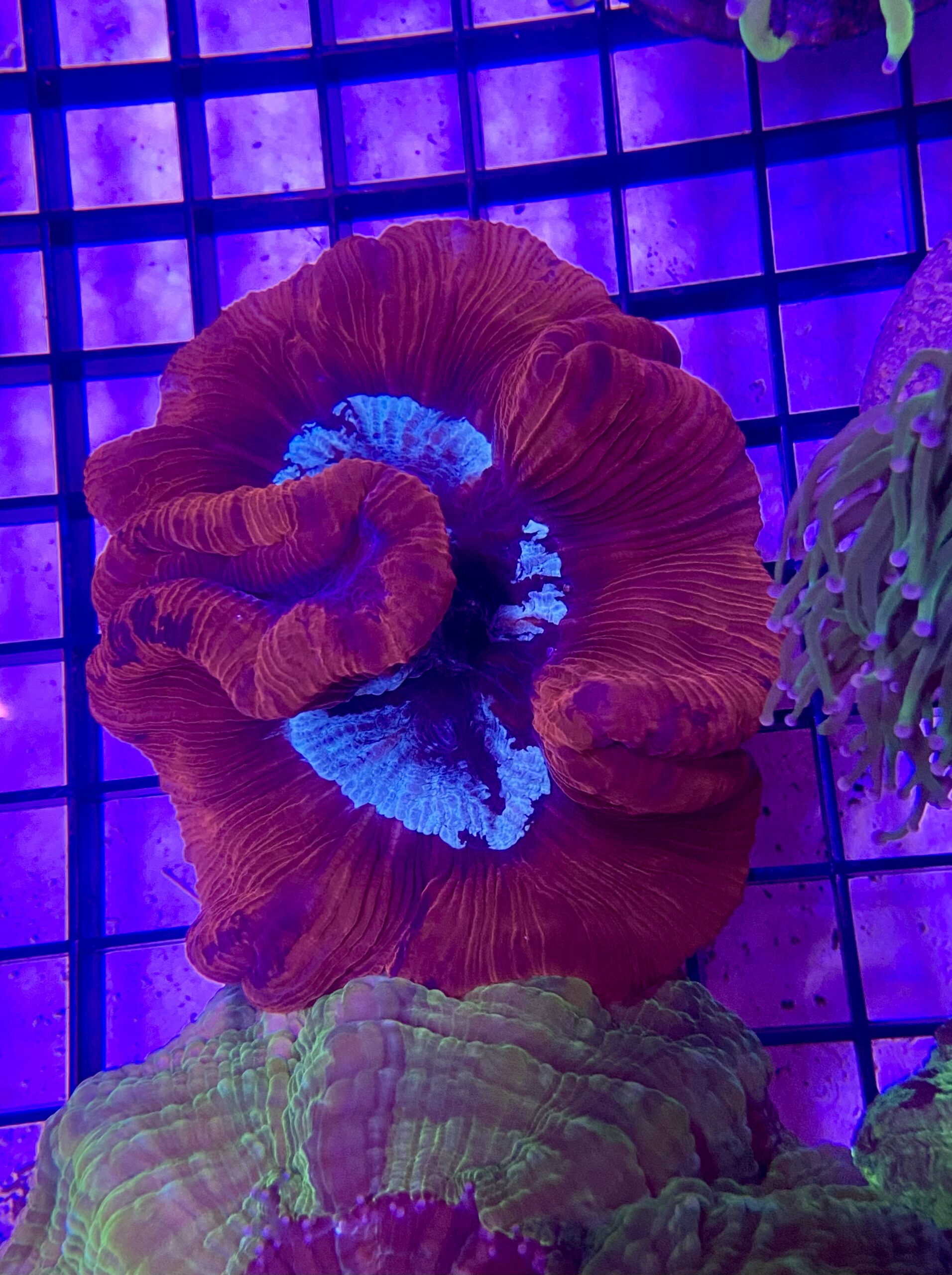 La Wellsophyllia radiata Red Metallic es un coral LPS solitario de gran tamaño, muy apreciado por su aspecto carnoso y sus tonos rojos metálicos intensos que cambian según la iluminación. Su superficie presenta pliegues marcados y un brillo iridiscente que le otorgan una apariencia única y elegante. Es una especie de crecimiento lento que prefiere iluminación moderada y un flujo de agua suave, condiciones que permiten mantener su tejido expandido y saludable. Requiere un espacio libre alrededor para evitar contacto con otros corales, ya que puede extender sus tentáculos urticantes. Ideal como coral protagonista en acuarios marinos de arrecife bien estabilizados.